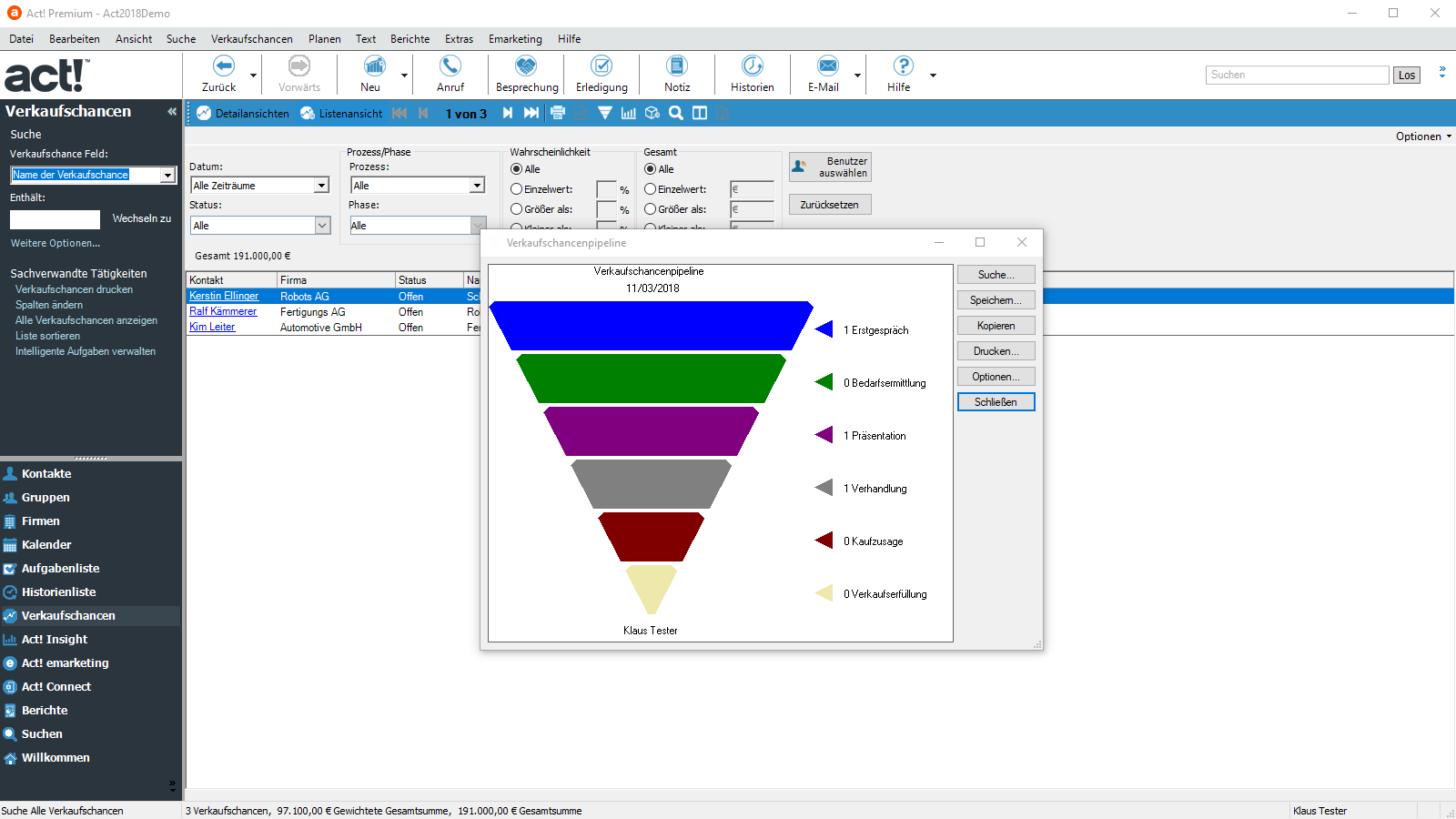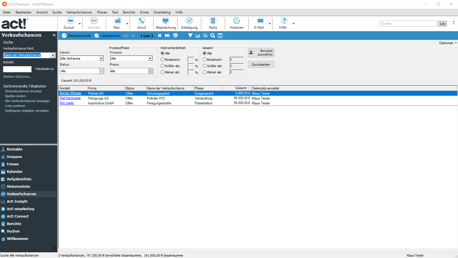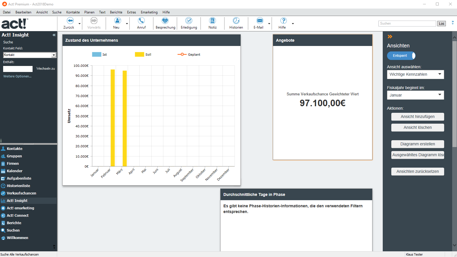 ACT! ausprobieren: (PC mit Windows 7 oder höher erforderlich). Sie können diese Version nach 30 Tagen oder auch später jederzeit mit einem gekauften Lizenzkey zur zeitlich unbegrenzten Nutzung freischalten. Alles, was Sie im Testzeitraum eingeben, bleibt vollständig erhalten. Starten Sie jetzt!